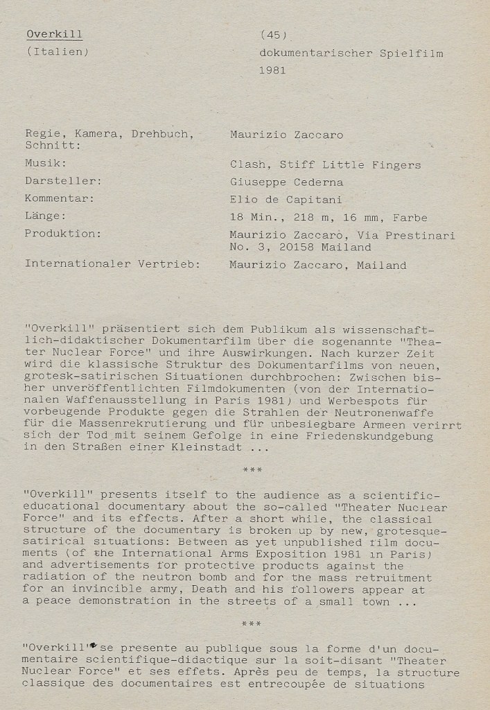 Nel 1982, selezionato per prestigioso 28 ° Festival Internazionale di Oberhausen (Repubblica Federale Tedesca), “OVERKILL” vince inaspettatamente il premio Ju.So. come miglior cortometraggio.