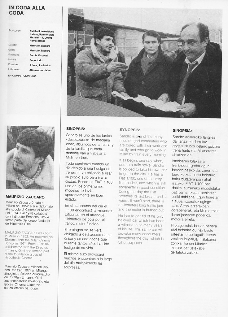 In coda alla coda è un doppio esercizio di bravura: innanzitutto lo è per il protagonista, un Alessandro Haber mattattore perennemente in scena dalla prima all’ultima sequenza del film; e poi, naturalmente, è l’occasione per Maurizio Zaccaro, esordiente dietro la macchina da presa, di mostrare quanto appreso collaborando negli anni precedenti con Ermanno Olmi (con il quale il sodalizio artistico proseguirà nei successivi decenni). Classe 1952, non più giovanissimo quindi, Zaccaro attende il momento giusto per debuttare come regista e gli va riconosciuta la giustezza della scelta: questo lavoro, un mediometraggio della durata di un’ora tonda, è un’opera di pochi fronzoli che racconta con toni asciutti una vicenda perennemente sul ciglio del surreale con al centro un personaggio lunare, affidato con evidente lungimiranza al citato Haber. Il regista figura anche come sceneggiatore e gode qui della partnership produttiva della Rai; il suo secondo lavoro, questa volta un lungometraggio, arriverà due anni più tardi e sfoggerà un altro ‘endorsement’ non da poco: sarà infatti Dove comincia la notte, scritto da Pupi Avati.