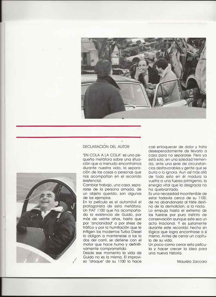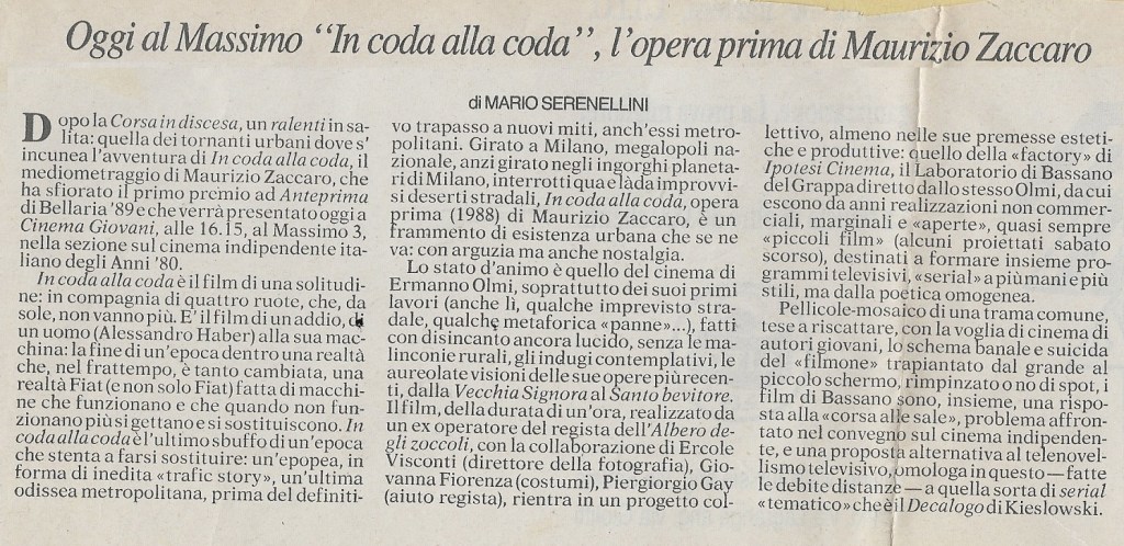 Si dice che i film realizzati non vanno mai più rivisti, e forse in questo c’è del vero. Infatti quando “In coda alla coda” viene riproposto in qualche retrospettiva, non posso fare a meno di pensare a Woody Allen: “Il mio primo film era così brutto che in sette Stati Americani aveva sostituito la pena di morte”. Tuttavia, bello o brutto, realizzato nell’inverno del 1987 a Milano, il film è stato comunque un buon viatico verso la professione che, all’epoca, tentavo d’intraprendere. Non avevamo soldi se non una manciata di milioni di lire elargiti da Ipotesi Cinema, non avevamo mezzi se non una macchina da presa, un po’ di pellicola, quattro luci e uno sgangherato carrello. E soprattutto non avevamo tempo perché avere tempo per fare bene il proprio lavoro è ancora oggi un lusso che non mi posso permettere. In poche parole “In coda alla coda” non sarebbe mai venuto al mondo se non fosse stato per la determinazione di quel “manipolo di amici”, veri e pazienti, che avevo messo insieme. Dodici in tutto, una “sporca dozzina” alla quale ancora oggi va tutta la mia riconoscenza e il mio affetto. Senza di loro, senza il loro aiuto e la loro incrollabile fiducia nel mio lavoro non sarebbe successo nulla di quello che invece è avvenuto dopo.