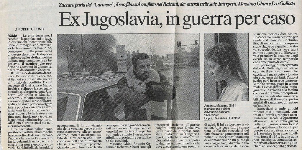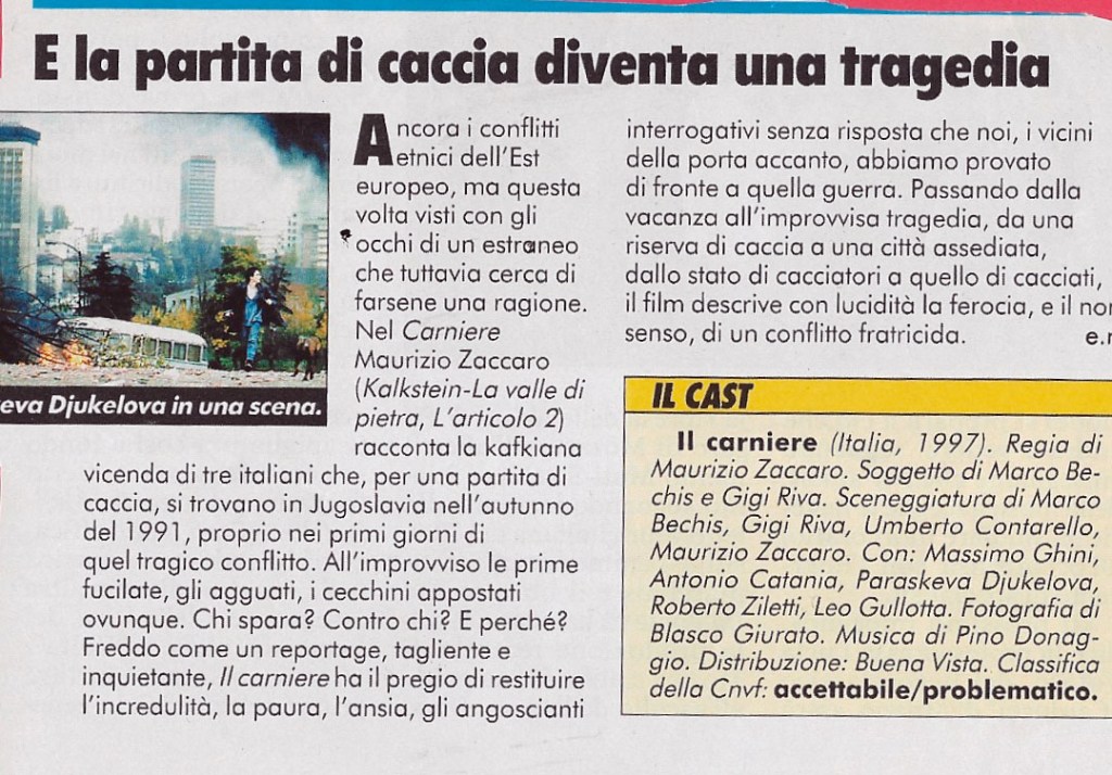 Il cinema italiano e la guerra nella ex Iugoslavia. È il primo caso: lo affronta Maurizio Zaccaro, allievo di Olmi, collaboratore di Pupi Avati, sostenuto da un testo cui, insieme con lui, hanno posto mano Marco Bechis, Gigi Riva, Umberto Contarello e Laura Fremder. Un testo che all’inizio, con abile senso dello spettacolo, sembra proporre solo una partita di caccia organizzata da un gruppo di italiani in una zona boscosa che potrebbe essere la Bosnia. Presto, però, con dei contrattempi: la guida che doveva attenderli non si fa trovare, una sua figlia che si è incaricata di sostituirla è ansiosa e piena di paure; fino a dei colpi di fucile che feriscono uno del gruppo, con una rapida corsa alla volta della città più vicina dove, di colpo, le atmosfere cambiano: folla negli ospedali, si spara dai tetti, carri armati nelle strade, militari di cui non si capiscono le intenzioni, in un disordine, anzi, in un caos sempre crescente.