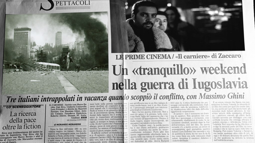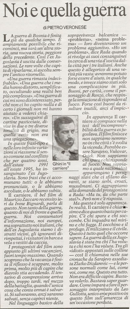 Mi dispiace che questo bel film di Maurizio Zaccaro, allievo di Ermanno Olmi e regista dell’affascinante LA VALLE DI PIETRA e dell’interessante giallo metafisico DOVE COMINCIA LA NOTTE, sia stato accolto tiepidamente da critica e pubblico e vittima di una pessima distribuzione nelle sale. IL CARNIERE e’ uno dei pochi film girati che parlano della controversa guerra civile combattuta in Jugoslavia nella prima meta’ degli anni 90′, con l’ONU e le potenze occidentali a fare da spettatori. Una spietata e sanguinosa guerra fraticida dove i figli arrivano a uccidere i loro padri. Una pellicola, che a quanto ricordo, sembra ispirarsi alla realta’, con dei cacciatori italiani che andavano spesso a caccia in Croazia e che si ritrovarono coinvolti nel conflitto balcanico, anche se nel film non viene specificata la localita’. Il sospetto comunque e’ che l’azione si svolga in Bosnia. Zaccaro gira con semplicita’ e onesta’, un film di grande impegno civile e di notevole impatto emotivo, che ci mostra la tragedia di un popolo, visto attraverso gli occhi di questi cacciatori che diventano, loro malgrado, “cacciati” e che sperimenteranno sulla loro pelle cosa significa diventare dei profughi. Molte le pagine da ricordare: le suggestive scene di caccia immerse in una splendida natura incontaminata con un’altrettanto suggestivo commento musicale, l’entrata in citta’ dei carri armati che fanno tremare i lampadari dell’albergo dove sono stipati i profughi con i volti terrorizzati dei bambini, strade deserte, case distrutte e auto incendiate. Bellissimo il finale. L’unico limite puo’ essere rappresentato da una confezione a tratti un po’ troppo televisiva. Ok tutti gli attori, un po’ impacciato il giovane Roberto Zibetti. In particolare emergono i personaggi di Carlo ( Leo Gullotta) un giornalista sportivo che si improvvisera’ suo malgrado corrispondente di guerra, quello di Rada, la ragazza serba interpretata dalla bravissima attrice bulgara Pareskeva Djukelova, ambigua e scontrosa, ma che fara’ di tutto per salvare i tre protagonisti, e il personaggio di Milan, un’individuo sanguigno e aggressivo, che in uno squalliduccio night club insulta Paolo e Roberto, “italiani mangiapasta di merda”, per poi mettere a repentaglio la propria vita pur di salvarli. Zaccaro in seguito dirigera’ per il cinema UN UOMO PER BENE, film che narra la vicenda giudiziaria di Enzo Tortora, per dedicarsi poi solo a regie televisive e documentari.