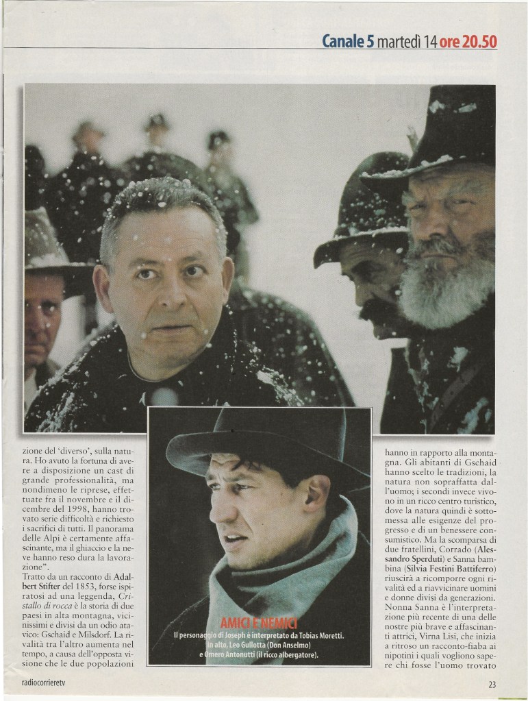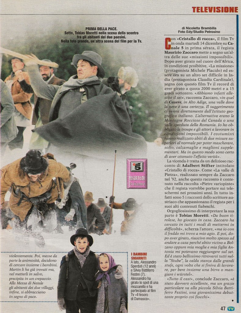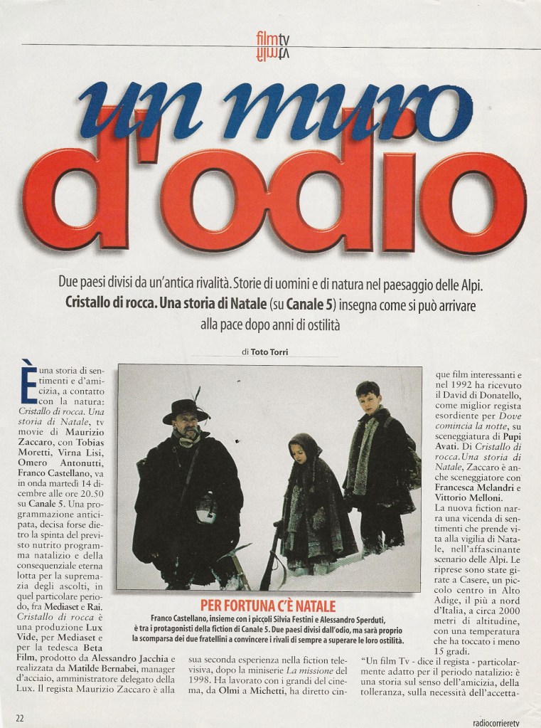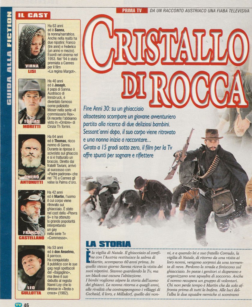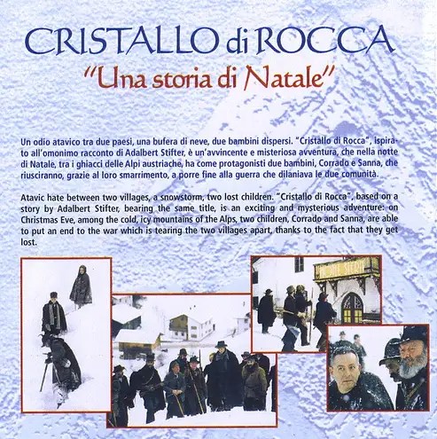 La notte di Natale, in alta montagna, due bambini, fratello e sorella, si smarriscono, perdono l’orientamento e attraversano un regno misterioso di neve, pietra e ghiaccio. La lunga notte trascorsa in una grotta è carica di insidie, di seduzioni e di mistero, (la grotta di Betlemme?) ma al tempo stesso è trepidante attesa del giorno nuovo, speranza di salvezza in una fuga dal pericolo e dall’ignoto. I bambini vengono trovati e salvati dal misterioso e suggestivo Martin, che qui rappresenta la figura cristiana di colui che salva perdendo la propria vita, quindi è lui , a mio avviso, il vero protagonista della storia. È bravissimo, Franco Castellano ad impersonalo. Tratto dal libro di Stifter, racconta una storia sottile e complessa, carica di sensi che vanno oltre l’orizzonte salvifico del prodigioso finale e lasciano intravedere nell’esperienza dei fanciulli smarriti la realtà della condizione umana. Il fascino di “Cristallo di rocca” – originariamente intitolato “La notte santa” – sta proprio nella felice ambiguità tra rappresentazione realistica e rappresentazione simbolica, tra vicende e spazi verosimili e il tempo mitico della sua cornice solo apparentemente favolistica., narrata con un occhio particolare alla tradizione di un Natale Vero che, oggi, vivono solo coloro che riescono, in qualche modo, a sottrarsi al modernismo e al consumismo