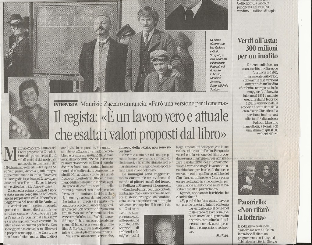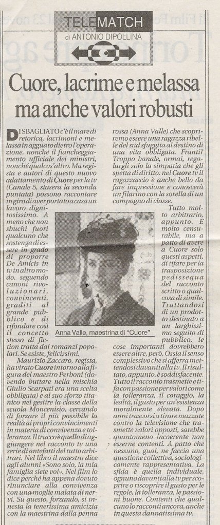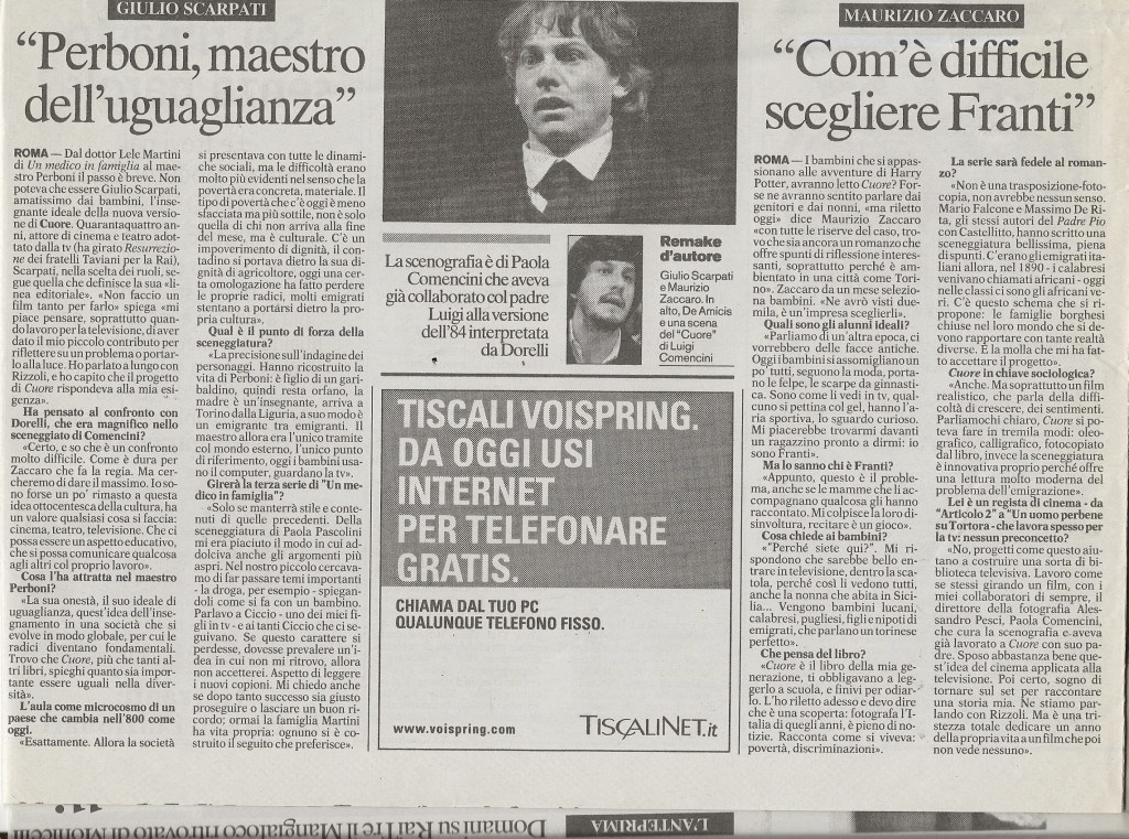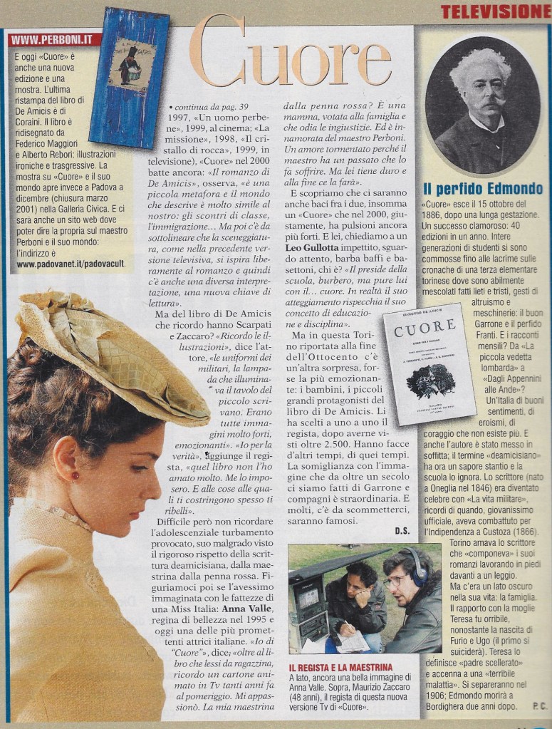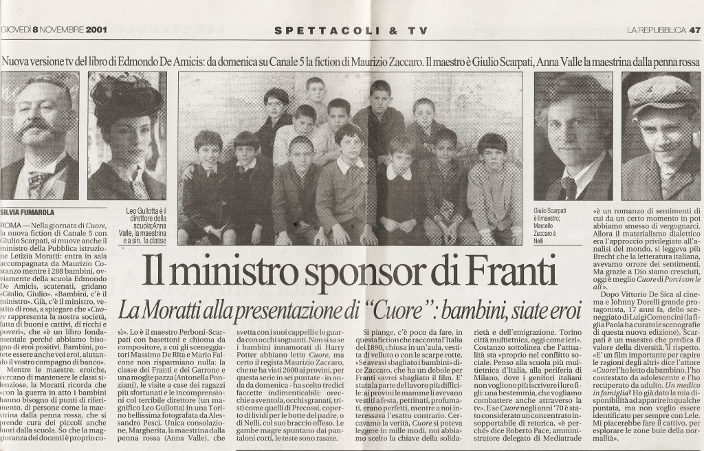 “Nelle nostre classi ci sono i magrebini o i senegalesi, una volta erano il calabrese Salvatore e il siciliano Precossi a esser descritti come “africani”, cioè diversi. Per non dire dello scontro fra povertà e ricchezza, una memoria storica da riscoprire, specie nella società omologata di oggi, in cui spesso a far la differenza è la griffe sullo zainetto. Ecco perché il recupero di Cuore, che ha caratterizzato l’infanzia di intere generazioni e arriva dopo il film del 1947 di Coletti e la versione televisiva di Comencini con Dorelli e la De Sio, merita questo sforzo produttivo e l’impegno di tante persone […]. Porta in sé il seme della nostra identità nazionale, è il ritratto neanche troppo retorico di come eravamo. Che poi… provate a seguire un quiz in Tv: dove crollano tutti? Alla domanda su Cavour, Mazzini, il Risorgimento. Scopo del film è far sì che quei sentimenti e quelle memorie non si disperdano nel nulla. […] Come tutti i testi imposti a scuola, anche Cuore era finito, ahimè, nel lungo elenco degli antipatici. In compagnia, fra gli altri, della Commedia umana di Saroyan, detestata da bambino e riscoperta, con infinito piacere, anni dopo. Ma del romanzo di De Amicis una cosa mi affascinava comunque: quelle magnifiche illustrazioni capaci di ricreare mondi lontani e figure emozionanti (il tamburino sardo, la piccola vedetta lombarda, le battaglie…)