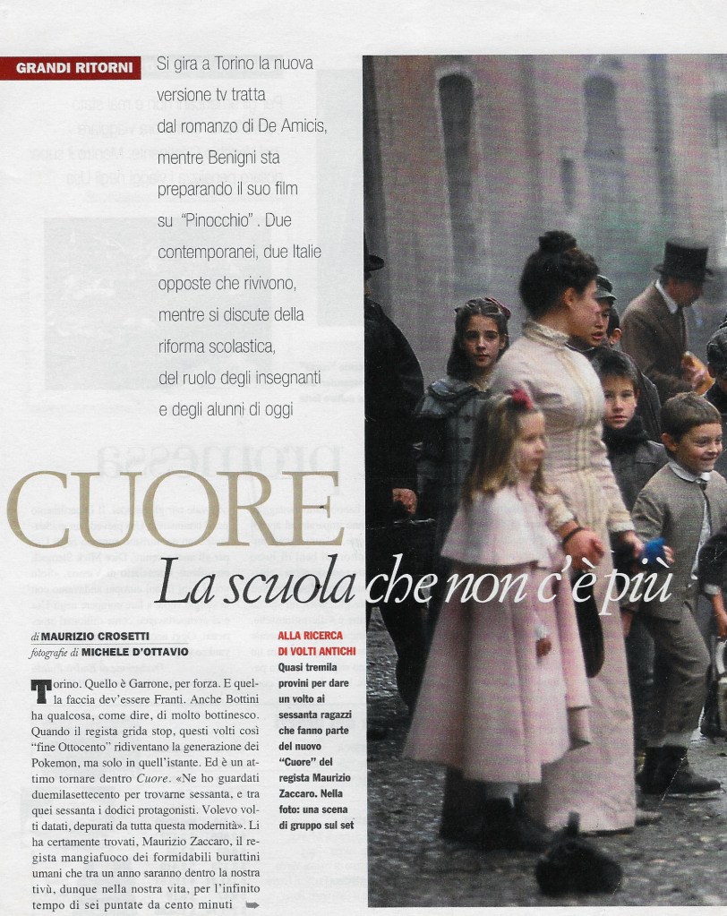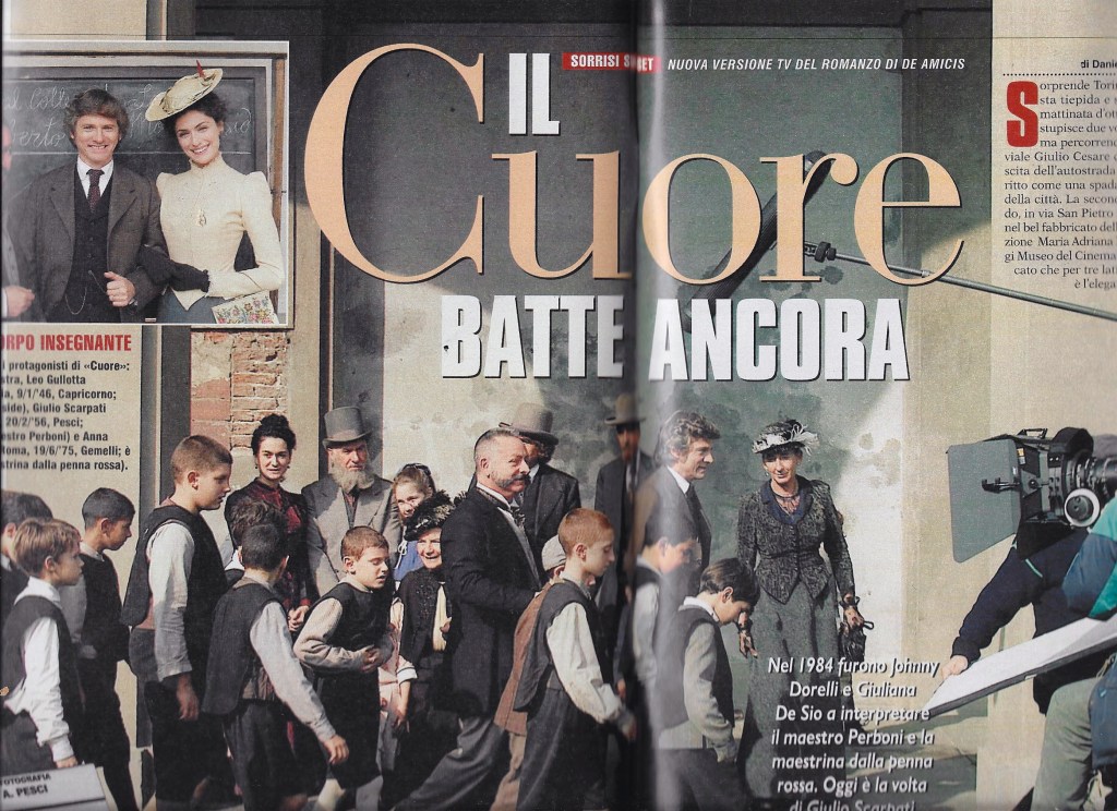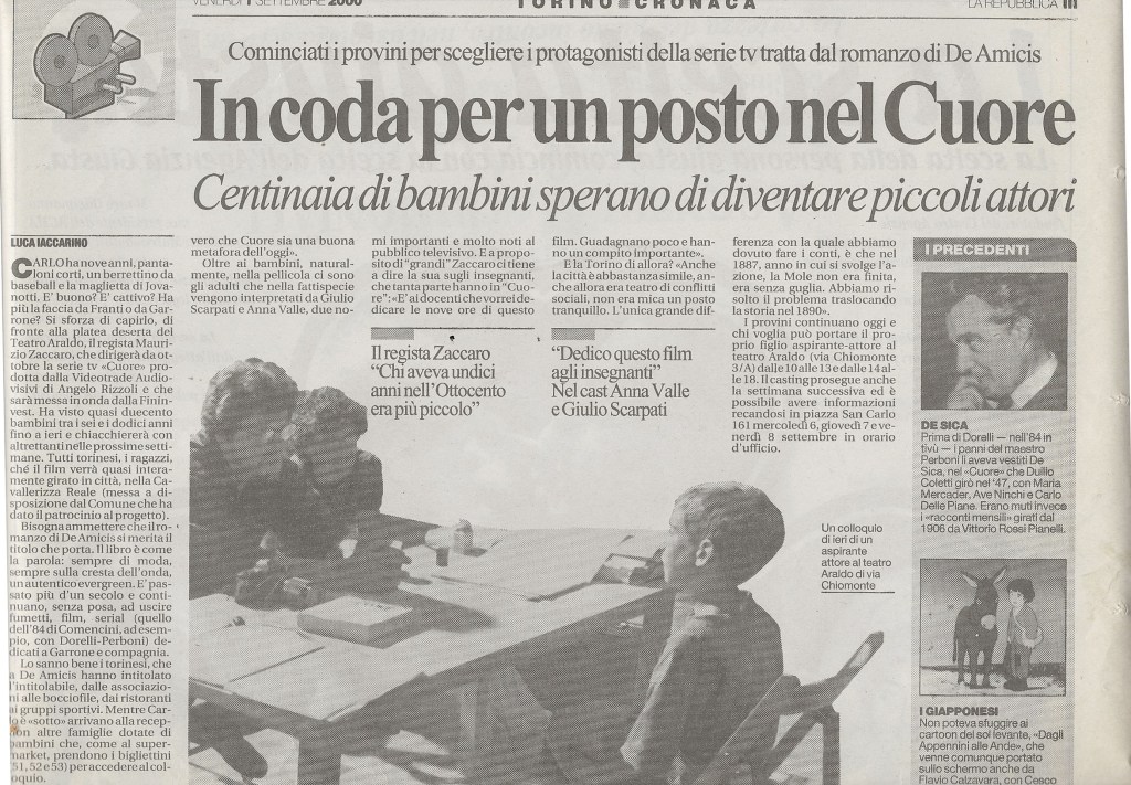Nessuno di loro era consapevole dell’impegno, della fatica alla quale sarebbe andato incontro se selezionato per uno dei ruoli principali, tantomeno conosceva bene la storia raccontata nel libro, il più delle volte riassunta in fretta dai parenti che li accompagnavano nel nostro ufficio, in Piazza San Carlo. Però erano tutti coinvolti, esaltati, eccitati dall’idea di fare quel “provino” per “il libro Cuore”. E qui sta la differenza. Nessun altro classico della nostra letteratura è mai stato definito in questo modo. Si dice infatti Pinocchio, non il libro di Pinocchio, Gianburrasca è Gianburrasca e basta e così tutti gli altri, sia essi dedicati all’infanzia o meno. Cuore, di Edmondo De Amicis , no. Dalla sua prima edizione del 1886 ad oggi, attraverso milioni di copie vendute e lette da tutte le generazioni, è sempre stato affettuosamente chiamato così: il libro Cuore.