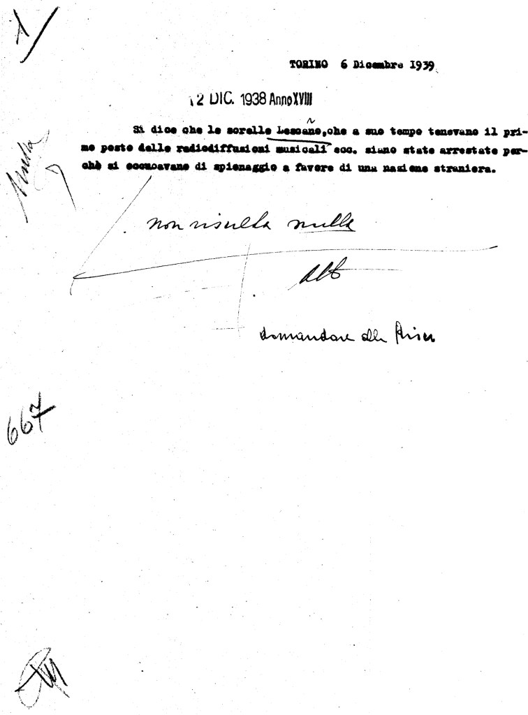 La parabola di Alessandra, Giuditta e Caterina Lescano – così italianizzano i loro nomi, in nome dell’autarchia – è vertiginosa. Ma ben presto arrivano le leggi razziali. Le sorelle sono straniere, di padre non ebreo e troppo famose per essere stroncate brutalmente dalle obbrobriose disposizioni: ottengono uno status speciale che consente loro di continuare a cantare. Ma non senza preoccupazioni, soprattutto per mamma Eva (in Olanda la sua famiglia sarà sterminata). Nel novembre del 1943, dopo un’esibizione al Teatro Grattacielo di Genova, le sorelle Lescano vengono arrestate. Difficile dire quanto rimasero a Marassi e come ne uscirono per raggiungere fortunosamente la madre, in clandestinità a Valperga Caluso nel Canavese.