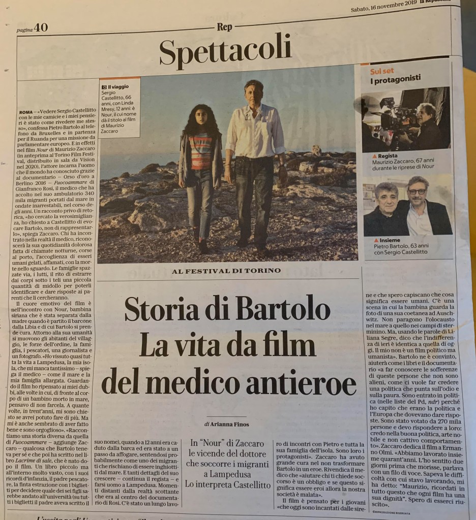 Venticinque anni dopo il discorso prosegue con Nour. Lampedusa, le strutture di primo soccorso, la disperazione di chi sbarca e di chi accoglie. Una piccola guerra quotidiana, vista con gli occhi del medico Pietro Bartolo (oggi eurodeputato), un eroe che lavora “nell’ultimo lembo di terra italiana”, come si sente alla radio. Il film è tratto dal romanzo Lacrime di sale: la mia storia quotidiana di medico di Lampedusa fra dolore e speranza, dove Bartolo racconta i decenni passati ad assistere, a curare e ad “aspettare”. Lo ripete Sergio Castellitto che lo interpreta, lo scrive lui nel suo romanzo. Bartolo è anche stato un personaggio cardine di Fuocoammare di Gianfranco Rosi.