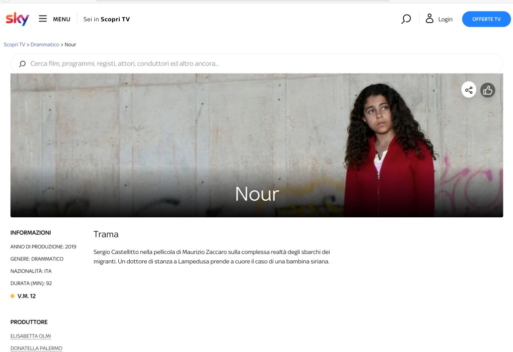Ecco, chissà che un piccolo film come Nour possa servire a farci tornare umani, consapevoli che siamo tutti figli di Adamo, appunto. Lo spero. Intanto, se volete, fate il passaparola, dite che questo film esiste, chiedetelo in programmazione ovunque voi siate, nei cinema come nelle scuole e, qualora lo vogliate, quel giorno sarò con voi, magari insieme a Pietro Bartolo, il medico di Lampedusa che durante i suoi trent’anni di lavoro al poliambulatorio dell’isola ha soccorso più di 350.000 esseri umani: donne, uomini e bambini approdati miracolosamente al molo Favaloro.