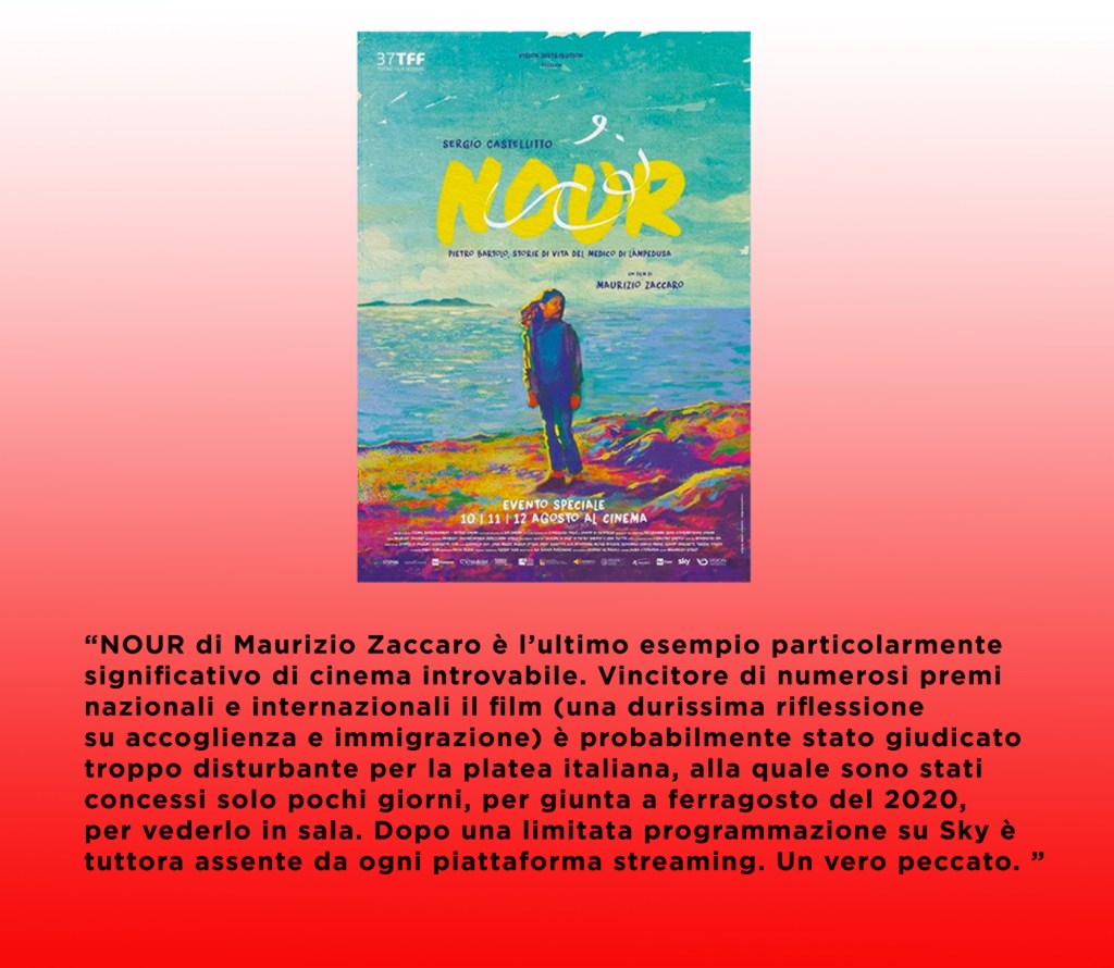 Il film è dedicato “a Ermanno”, cioè Ermanno Olmi, il regista scomparso nel 2018. Al tema dei migranti Olmi dedicò uno dei suoi ultimi film, “Il villaggio di cartone”, e non sorprende quindi che l’amico-allievo Maurizio Zaccaro, coinvolgendo due figli del cineasta bergamasco, la produttrice Elisabetta e il direttore della fotografia Fabio, riprenda il discorso, naturalmente in una chiave diversa. “Nour” esce nelle sale con Vision Distribution, come evento speciale, il 10, 11 e 12 agosto, poi sarà su Sky dal 20 di questo stesso mese. Consiglio di vederlo, perché è girato e recitato bene, dice cose ragionevoli su un argomento così delicato, anche fortemente “divisivo”, pesca nella realtà, nel senso che è una storia vera tratta dal libro “Lacrime di sale” scritto dal noto medico siciliano Pietro Bartolo, da pronunciarsi con l’accento sulla prima o.