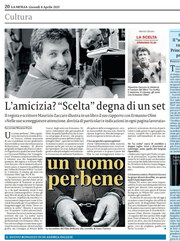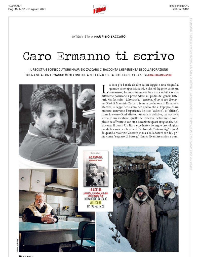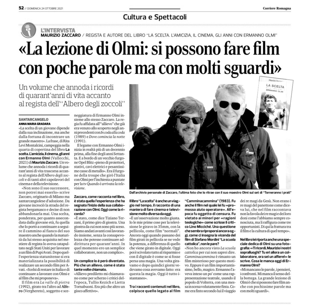 A tre anni dalla scomparsa di Ermanno Olmi, grande protagonista del cinema italiano e internazionale, Maurizio Zaccaro ripercorre i quarant’anni trascorsi al suo fianco. La scelta. L’amicizia, il cinema, gli anni con Ermanno Olmi (Vallecchi Firenze, 2021) non è una semplice biografia, ma è la storia di due vite intrecciate, quelle di Olmi e del suo “discepolo” Zaccaro. In questo libro, corredato di foto che li ritraggono sui set, l’autore riporta aneddoti, dialoghi, retroscena, paesaggi, progetti e sogni, compresi quelli mai realizzati e rimasti come sospesi per impedimenti vari.