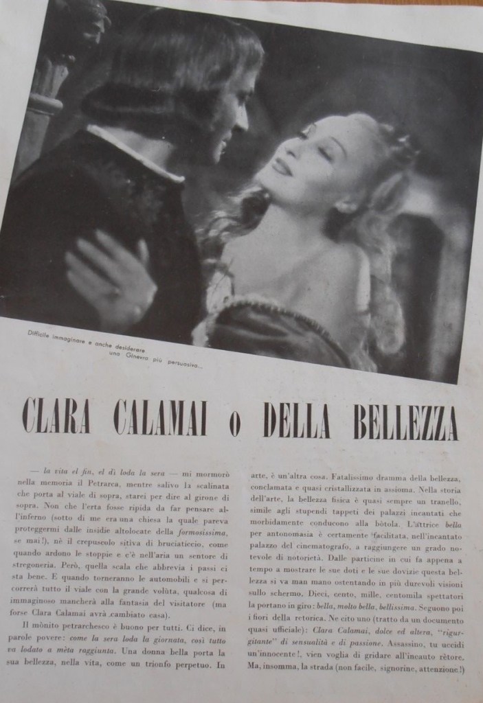“Una delle attrici più ammirate del cinema dei telefoni bianchi: una popolarità raggiunta grazie ad una recitazione misurata e grazie ad un fascino misterioso e conturbante. Altera, distaccata, a volte un po’ gelida, Clara Calamai, impersonando con classe e voluttà cortigiane e amanti, ottiene una popolarità enorme, amatissima dal pubblico maschile per cui rappresenta l’ideale della vera donna fatale.”