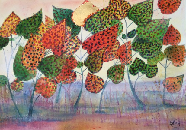 “UNA FOGLIA D’ORO” ” STAMPA NUMERATA 1/100 – AUTOGRAFATA – CARTA MODIGLIANI NEVE GR.320 DA ORIGINALE ACQUERELLO, CHINA E FOGLIE ORO.