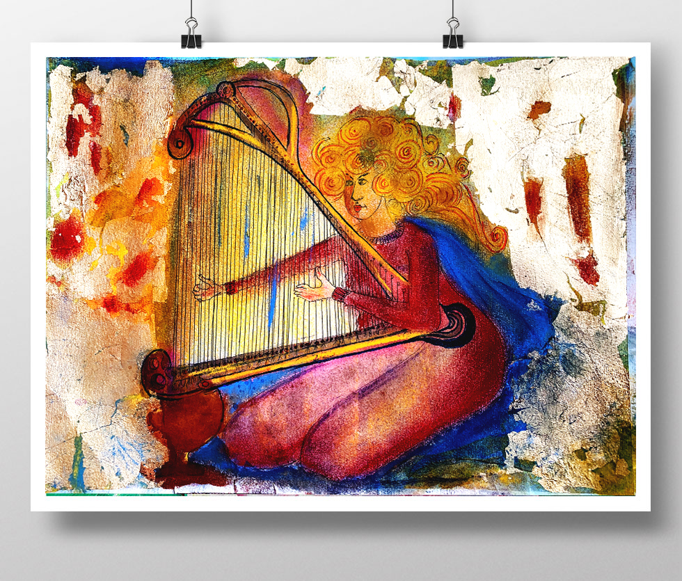 “SUONATRICE DI CETRA” – ACQUERELLO, CHINA , FOGLIE D’ORO. ORIGINALE IN COLLEZIONE PRIVATA – NON IN VENDITA
